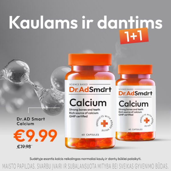 Maisto papildo Dr.AD Smart Calcium sudėtyje esantis kalcis reikalingas normaliai kaulų ir dantų būklei palaikyti, kalcis padeda palaikyti normalią raumenų veiklą. Vitaminas D padeda palaikyti normalią kalcio koncentraciją kraujyje, padeda palaikyti normalią kaulų ir dantų būklę bei normalią raumenų funkciją.
