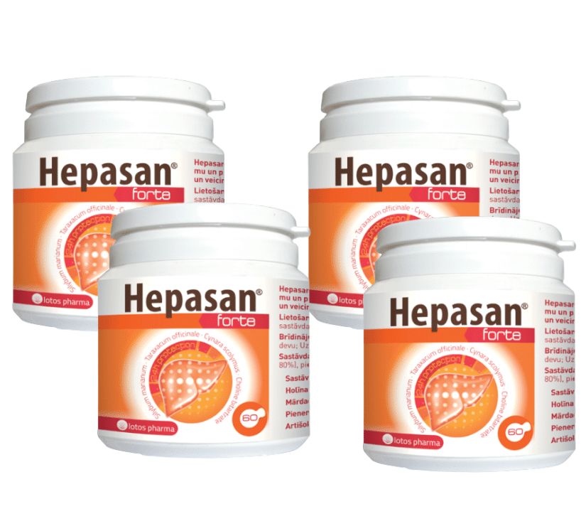 Maisto papildas. Hepasan Forte 60 kapsulių esančioje pakuotės sudėtyje yra cholino ir augalinių (tikrojo margainio sėklų, kiaulpienių šaknų, artišoko) ekstraktų. Sudėtyje esantis cholinas padeda palaikyti normalią lipidų ir homocisteino apykaitą bei normalią kepenų funkciją.