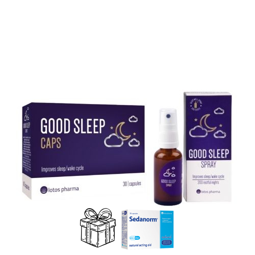 Rinkinio sudėtyje Good Sleep Caps, 30 kapsulių ir Good Sleep Spray, 30ml.